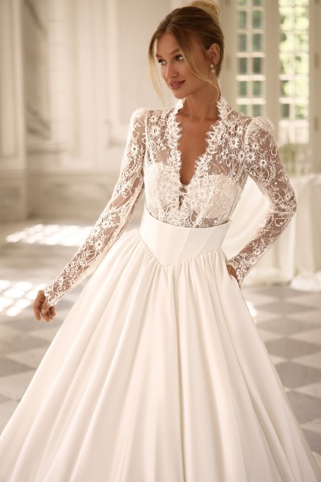 Ponadczasowa suknia w linii A, łącząca wytworną klasykę z wyrazistym, lekko drapieżnym akcentem. Górę sukni tworzy koronkowy top z pięknej koronki Chantilly – głęboki, zmysłowy dekolt w kształcie litery V z przodu i subtelnie zapinany na guziczki tył podkreślają delikatną siateczkę i satynowe wstawki o delikatnym połysku. Długie, dopasowane rękawy w całości wykonane z przezroczystej koronki dodają elegancji i sprawiają, że suknia wygląda olśniewająco zarówno z przodu, jak i z tyłu.