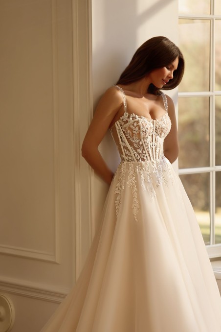 Suknia ślubna w stylu A-line o romantycznym charakterze, wykonana w odcieniu ivory.