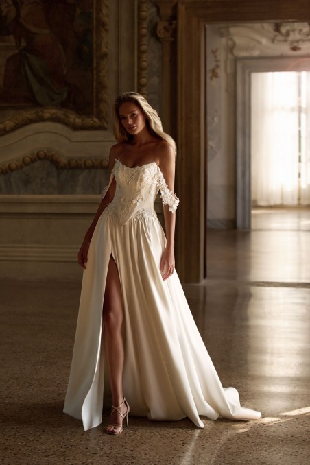 Elegancka i zmysłowa suknia ślubna w stylu A-line (księżniczka z lekkim flow), wykonana z luksusowego błyszczącego mikado w kolorze ivory. Gorset o strukturalnej formie ozdobiony jest delikatnymi, trójwymiarowymi aplikacjami koronkowych kwiatów z subtelnym perełkowym połyskiem, które delikatnie schodzą na biodra. Dekolt typu off-the-shoulder podkreślają odpinane rękawy/strapsy z tej samej kwiatowej koronki – idealne na ceremonię i romantyczny akcent.