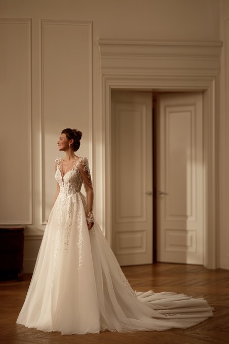 Głęboki dekolt V, przezroczyste, długie rękawy i ozdobne plecy z guzikami dodają romantyzmu bez przesady.