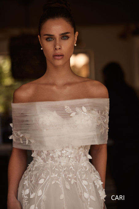 Bogate zdobienia w postaci koronkowych aplikacji 3D, gipiury oraz misternych haftów sprawiają, że suknia zachwyca detalami. Cekiny i korale wplecione w tkaninę dodają blasku, idealnie współgrając z tiulem, który nadaje lekkości i zwiewności. Suknia jest bez rękawów, co podkreśla jej elegancki i ponadczasowy styl.