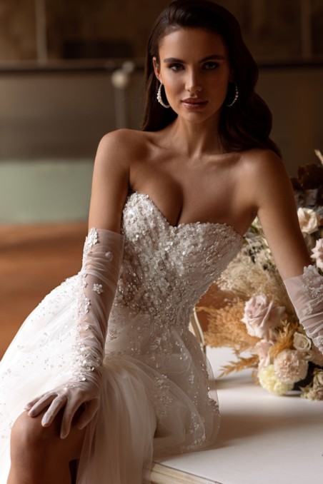 VIVDIA - suknia ślubna o klasycznej sylwetce A-line wykonana jest z najwyższej jakości materiałów: gorset uszyty z koronki, siatki i euro-greckiego materiału jest bogato zdobiony koralikami, cekinami, kryształkami i perełkami, co nadaje mu eleganckiego blasku.