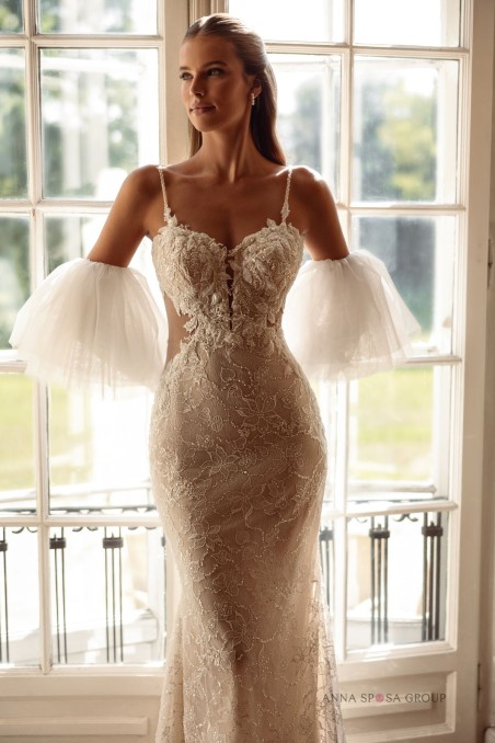 Suknia ozdobiona jest misternie haftowaną kwiatową koronką, koralikami i cekinami, które dodają jej blasku i wyrafinowania. Cienkie ramiączka podkreślają subtelność, a odkryte plecy wprowadzają zmysłowy akcent.