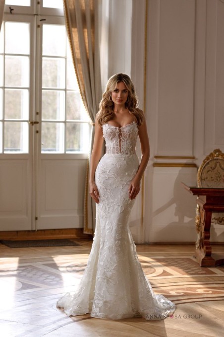 Zachwycająca ELVI to propozycja dla panny młodej, która marzy o wyjątkowej elegancji z nutą zmysłowości. Ten dopasowany fason typu syrenka idealnie podkreśla kobiecą sylwetkę, delikatnie opinając biodra i z wdziękiem rozszerzając się ku dołowi.