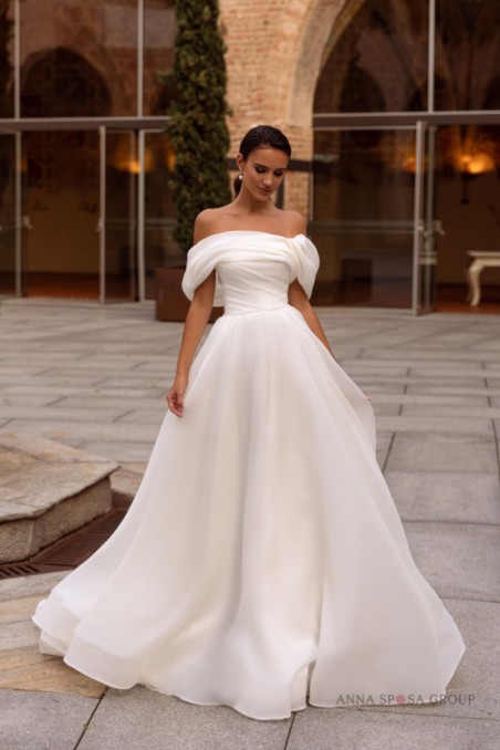 Minimalistyczna suknia z warstwową spódnicą i drapowaniem. Gorset jest uzupełniony lejącymi rękawami, które podkreślają obojczyki i kruchość panny młodej. Tworząc delikatny wygląd, który nie jest obciążony ozdobami, ale doskonały w swojej prostocie.