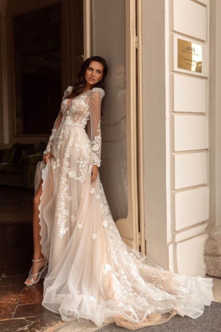 Góra wykonana z siateczki, a spódnica z tiulu, tiulu hayal i organzy, tworzy lekki, wielowarstwowy efekt z długim, spektakularnym trenem. Suknia posiada długie, lekko bufiaste rękawy, dodające jej romantycznego charakteru. Bogato zdobiona ręcznie robioną kwiatową koronką, wyszywaną koralikami i cekinami, prezentuje się niezwykle efektownie. Głęboki dekolt w kształcie litery V z cielistymi wstawkami z siateczki oraz odkryte plecy nadają sukni uwodzicielskiego wyglądu. Odpinana spódnica i odpinane szorty dodają jej funkcjonalności i nowoczesnego uroku.