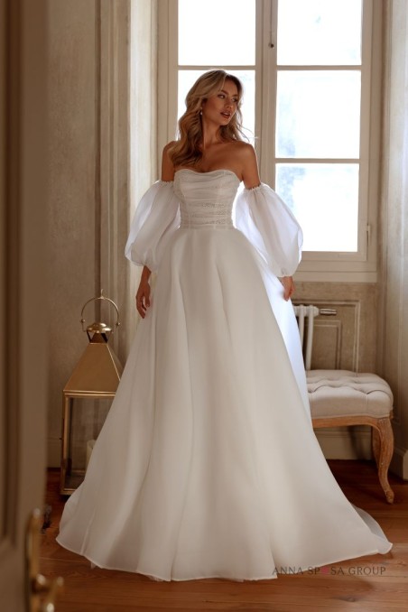 Suknia TOINET to delikatna kreacja ślubna o klasycznej linii A, wykonana z organzy, euro-greku, siatki, tiulu hayal, eurotafty i sztywnej siatki. Utrzymana w kolorze ivory, suknia emanuje elegancją i subtelnością. Gorset zdobi oryginalna draperia, haftowany koralikami i perłami, co nadaje mu wyrafinowanego charakteru. Wielowarstwowa spódnica jest lekka i zwiewna, idealnie komponując się z minimalistycznym stylem sukni. Dodatkowe akcesoria, takie jak odpinane bufiaste rękawy i rękawiczki, wprowadzają element kobiecości i figlarności.