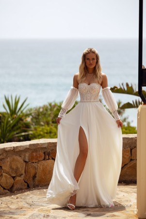 Romantyczna suknia o klasycznej sylwetce w kształcie litery A. Sukienka ma minimalistyczny wystrój, gorset jest haftowany cienką koronką boho. Spódnica jest wykonana z lekkiego, lejącego materiału i ma głęboki rozporek z boku. Całość idealnie dopełniają oryginalne bufiaste odpinane rękawy ozdobione koronką.