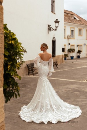 Luksusowa dopasowana suknia, która doskonale podkreśla figurę, z długim spektakularnym trenem. Suknia jest bogato zdobiona kwiatową koronką o dużej objętości, wyszywaną koralikami i cekinami. Dmuchane odpinane rękawy wykonane z cienkiej delikatnej koronki uzupełniają wygląd i sprawiają, że jest jeszcze bardziej spektakularny.