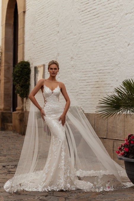 Efektowna dopasowana suknia na cienkich ramiączkach. Suknia jest bogato haftowana matową koronką w kwiaty i ma półprzezroczyste wstawki z siatki po bokach w talii, które modelują sylwetkę. Odkryte plecy, cienkie ramiączka i głęboki dekolt sprawiają, że całość wygląda bardzo uwodzicielsko. Długi, odpinany pelerynowy tren *) wykonany z lekkiej siateczki i obszyty koronką tworzy wyjątkowy efekt.