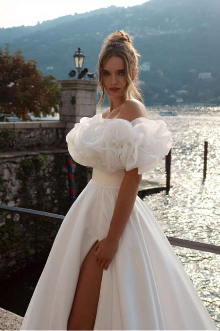 Ta sukienka to prawdziwy klejnot tego sezonu ślubnego! Z obszernymi kwiatami 3D, które stały się prawdziwym trendem w latach 2024-2025, dodając wyjątkowego uroku. A uwodzicielskie rozcięcie na spódnicy dodaje wyrafinowania i tajemniczości. Ta sukienka to ucieleśnienie stylu i zmysłowości. Przygotuj się na to, by zostać oczarowaną i zaimponowaną w najważniejszym dniu