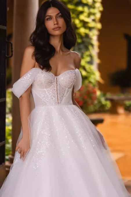 Wkrocz do bajki z tą czarującą suknią ślubną w kolorze kości słoniowej, zaprojektowaną dla nowoczesnej księżniczki. Model z pięknie zakrytymi plecami ozdobionymi misternym sznurowaniem, oferuje bezpieczne i eleganckie zapięcie. Dopasowany gorset podkreśla sylwetkę, podkreślając naturalne krągłości, zapewniając jednocześnie wygodę. Suknia wykonana z luksusowego połączenia koronki i cekinów, mieni się przy każdym ruchu, a długa, nieprzezroczysta podszewka zapewnia idealne dopasowanie. Odpinane długie rękawy, które pozwolą Ci bez wysiłku zmienić swój wygląd z ceremonii na uroczystość. Ta sukienka bez rozcięcia w spódnicy emanuje klasyczną elegancją, dzięki czemu jest ponadczasowym wyborem na Twój wyjątkowy dzień.