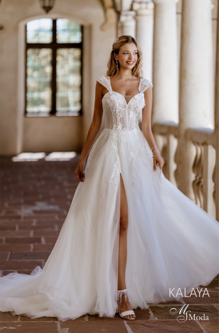 Efekt całości: Suknia Kalaya to idealne połączenie nowoczesnej zmysłowości (prześwitujący gorset, rozcięcie) i romantycznego stylu (tiulowa spódnica, koronkowe aplikacje). Sprawdzi się u Panien Młodych marzących o kreacji lekkiej, ale jednocześnie efektownej.