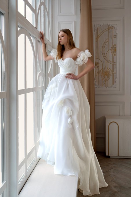 Dla panny młodej marzącej o niezapomnianej, bajkowej kreacji nasza suknia ślubna z organzy o kroju A-line z trójwymiarowymi kwiatami to prawdziwe arcydzieło.